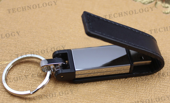 USB Modelo PL03 con terminado en Piel, elegante y portable con aro de metal, para que lo hagas llavero Se puede marcar su logotipo en estampado, serigrafía o grabado láser.