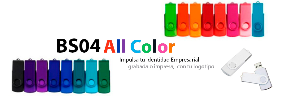 La USB modelo BS04 All Color con diseño giratorio sin tapa, en plástico y área de marcado en aluminio al mismo color o con la combinación que tu desees, para la total proyección de tu marca en el color que identifica más a la misma, ideal para grabado en láser o en serigrafía hasta 4 tintas, con aro de aluminio para poder transportarla en tu llavero, modelo básico manejado en existencia en varios colores-